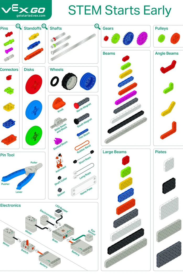 VEX GO dạy các nguyên tắc cơ bản của STEM thông qua các hoạt động thực hành giúp học sinh cảm nhận và thực hành một cách vui vẻ và tích cực. VEX GO là hệ thống xây dựng STEM dành cho học sinh lớp 3 – 6. Bộ dụng cụ của VEX GO Classroom Bundles chứa tất cả các bộ phận, động cơ và thiết bị điện tử cần thiết để đưa STEM vào cuộc sống.